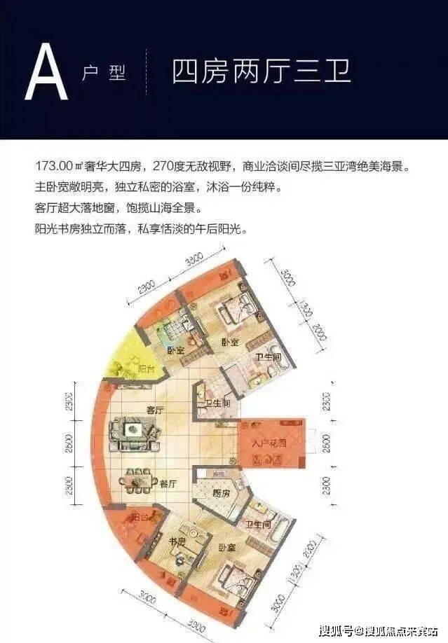 173.00㎡奢华大四房,270度无敌视野,商业洽谈间尽揽三亚湾绝美海景。主卧宽敞明亮,独立私密的浴室,沐浴一份纯粹。客厅、餐厅、景观阳台三位一体,既可与家人品味佳肴,又可邀约朋友高端人士欢聚一堂。