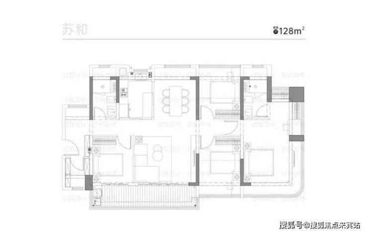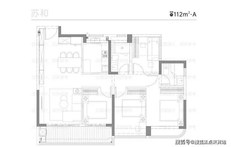 约112平的四房A户型,整体格局有点像约87平户型的放大版。