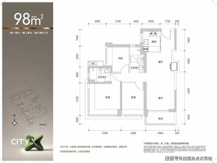 建面约98㎡3房2卫,适合追求尺度的家庭。