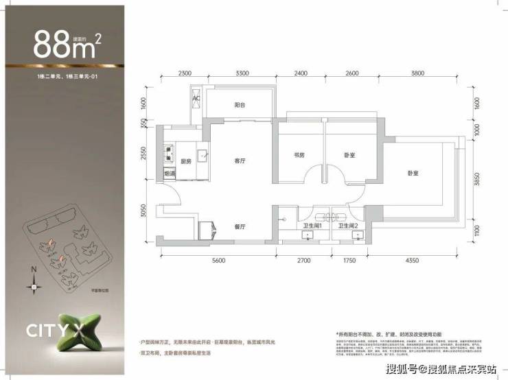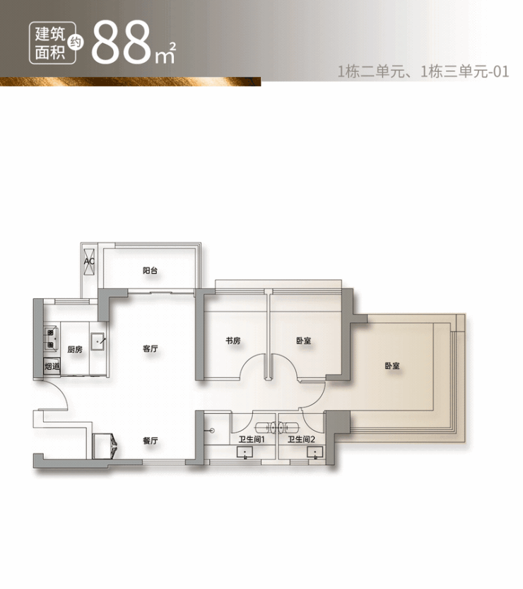 88平户型,南北通透的双厅设计,不论楼层高低通风采光视野均非常舒适通透,适合三口之家从容生活。