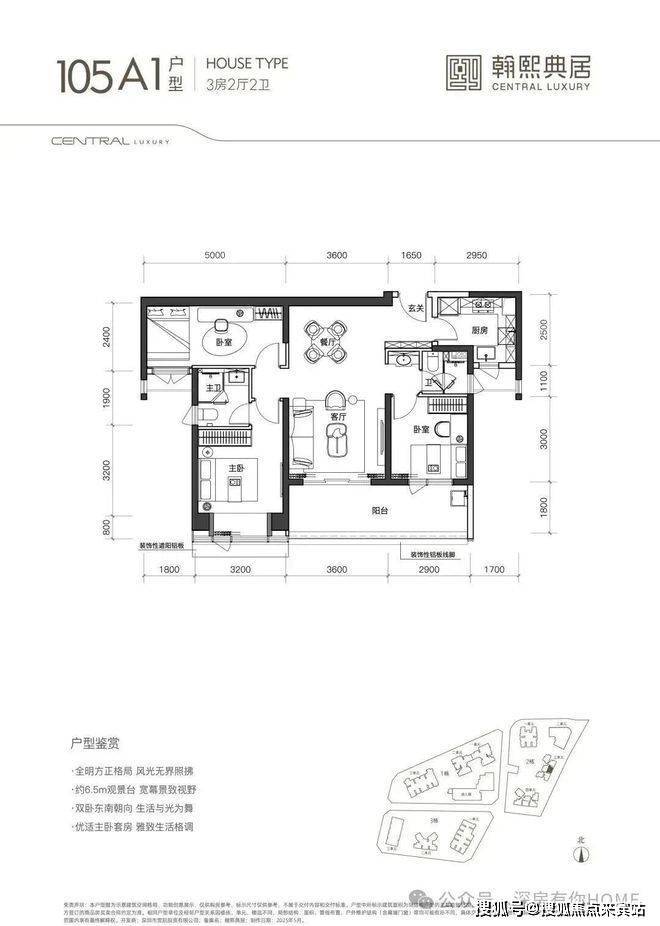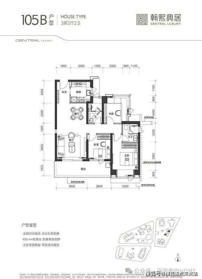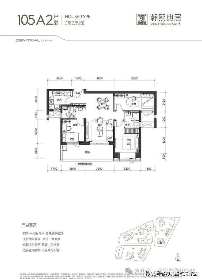 105㎡的3房2厅2卫双阳台设计竖厅格局,客厅与卧室连通超大阳台,LDK一体化设计,主卧带270°转角飘窗,看城市景观,主要朝向为西南和东南。