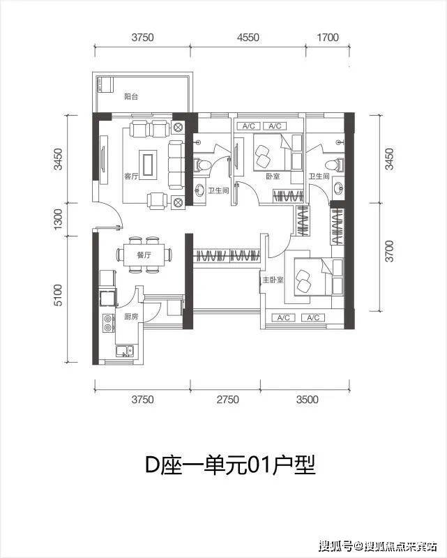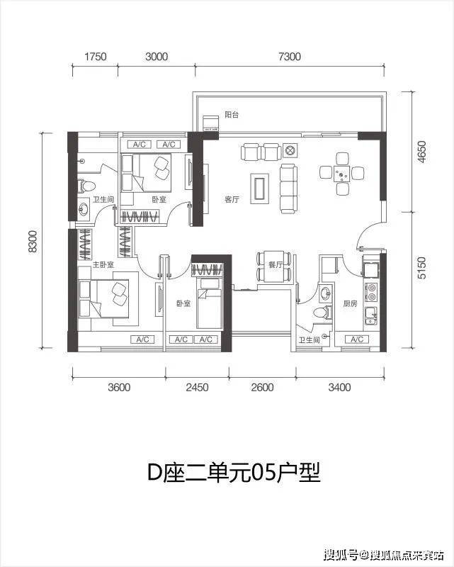 D栋一单元03户型:93㎡ 3房2厅2卫