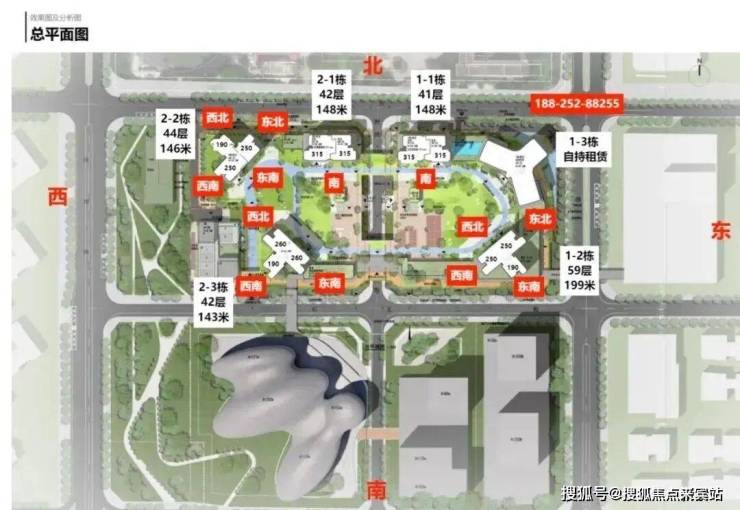 总楼层:1A栋41层;2A、2B、2C栋42层,1B栋59层,1C栋自持租赁54层,幼儿园4层。