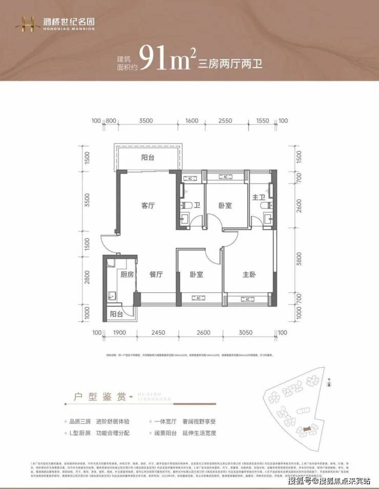 91㎡的3房2厅2卫:竖厅南北通透格局,客厅3.5米开间,LDKB一体化设计,3个卧室分别做到了3.05米/2.6米/2.55米的宽度,L型厨房带1个小生活阳台,卫生间干湿分离,阳台主朝正北向