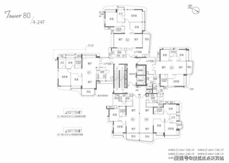 80栋户型涵盖:83、105、109、115、120㎡,2梯5户。