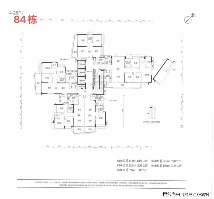 84栋户型涵盖:74、83、105、120、144㎡,3梯5户。