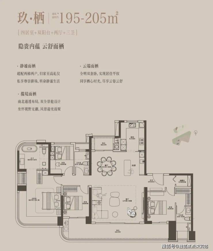 主力户型建面约126-143㎡四房:方正格局,功能完善建面约195-205㎡四房:独立电梯入户,中西双厨房建面约278-282㎡四房:"超流体全景舱"设计,三阳台配置所有户型均采用高品质精装交付,选用一线品牌建材