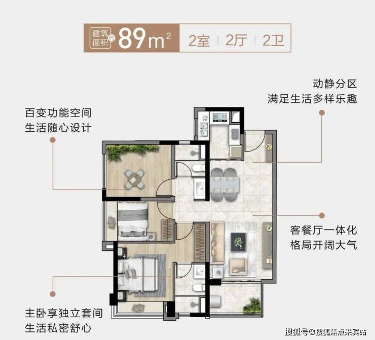 89㎡三房:竖厅设计+双卫,适合新婚家庭,总价135万起即可上车核心区。