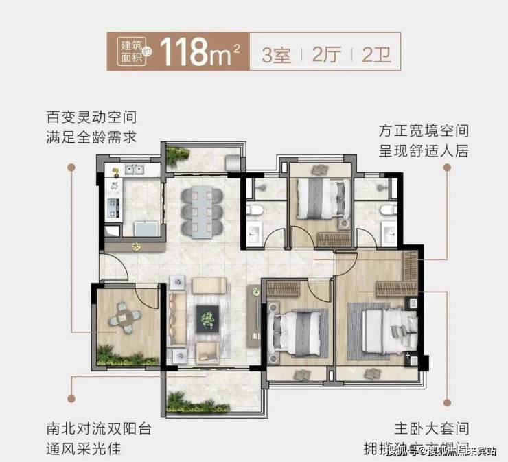 107-118㎡四房:横厅布局+南北双阳台,二胎家庭或三代同堂首选。