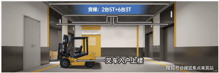 顶配货物运输系统,罕见2*5T+6*3T的高荷载货梯,一流的运载力,叉车入户上楼,垂直运输能力翻倍