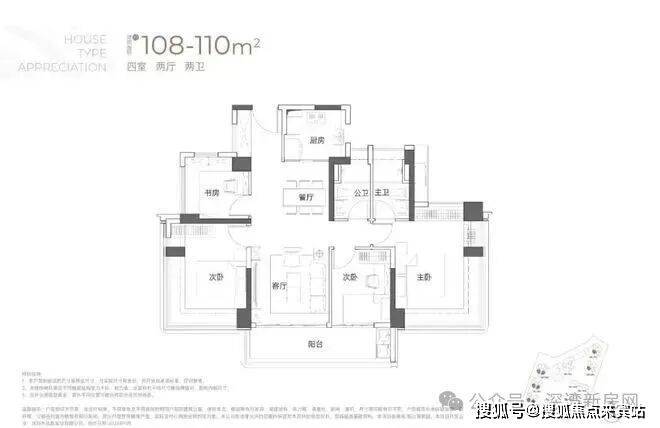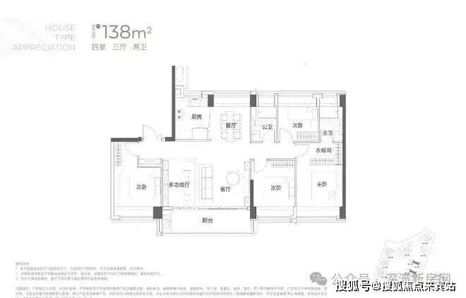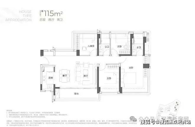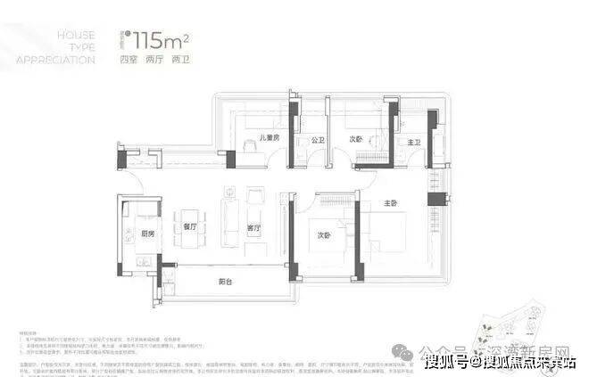 竖庭格局,西南向,基本居住功能与建面约108-110㎡4房2卫一致,但格局不一样,从目前公布的户型图上看,主要是主卧空间有了更大的提升,比如可以放更大一点的衣柜。