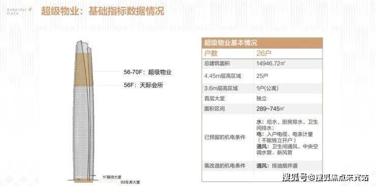 大百汇广场 | 超级物业-建筑指标【建筑面积】约1.5万㎡【建筑高度】约260-380米【所属层数】56-70层【产权单位】共26套【户型面积】含289-745㎡商办产品25套约380㎡商务公寓1套【物业管理】卓越商企服务【专梯直达】配置日立电梯9部穿梭梯4部,入户观光梯4部,消防梯1部【专属大堂】1层配备专属接待大堂负1层可联通29万㎡卓悦中心商业【专属停车场】B2层尊享专属落客大堂配备独立分区停车位共77个