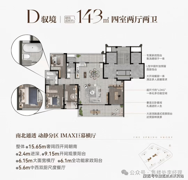 专属家政阳台集洗晒晾于一体,L 型中厨外加预留西厨岛台,大开间餐厨一体,满足多人就餐需求。超尺寸的 “LDKG” 一体化多功能空间,让生活更加便捷。奢适主卧套间,尽显品质生活。大进深跑道式观景阳台,可近赏园林美景。南北通透,动静分区,IMAX 巨幕横厅,整体 15.65m 奢阔四开间朝南,给人极致的居住享受。