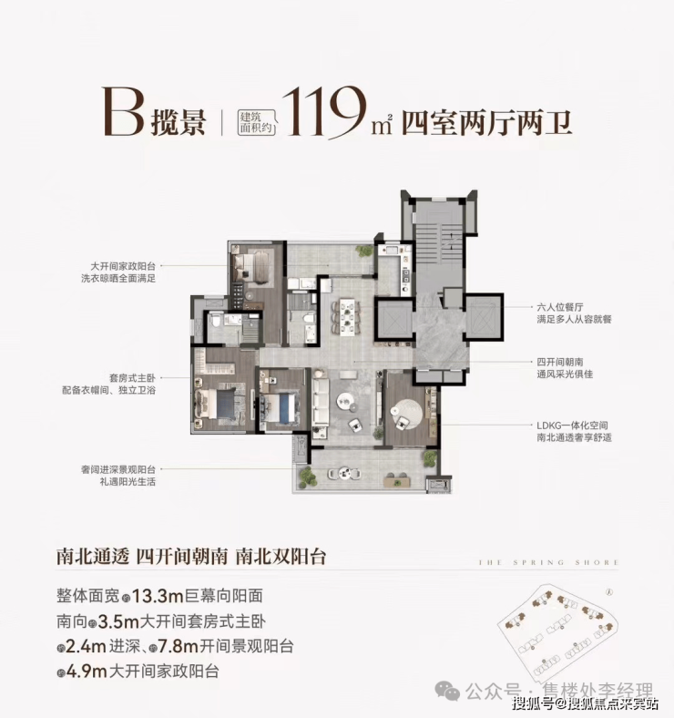 大开间家政阳台满足洗衣晾晒需求。六人位餐厅可让多人从容就餐。四开间朝南,通风采光绝佳。LDKG 一体化空间,让活动区域更宽敞。南北通透,奢享舒适生活。奢阔进深景观阳台,尽情享受阳光。南向 3.5m 大开间套房式主卧,还有 2.4m 进深、7.8m 开间景观阳台以及 4.9m 大开间家政阳台,整体面宽 13.3m 巨幕向阳面,居住体验超棒。