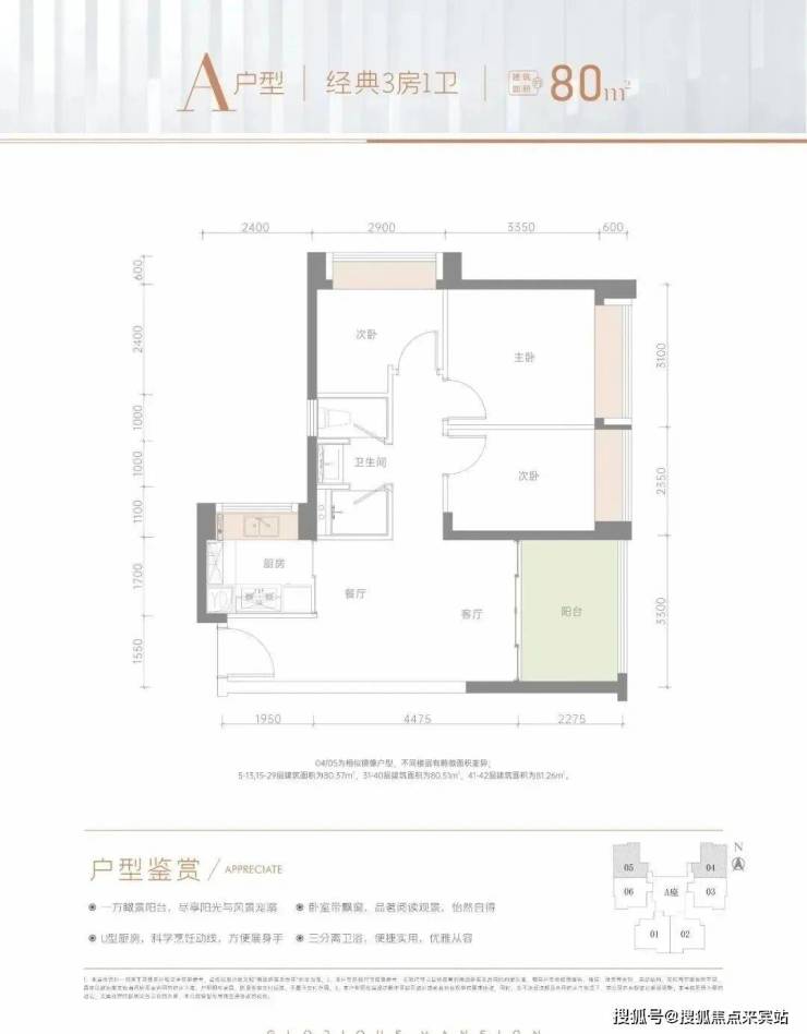 80㎡的3房2厅1卫,1栋A座04.05户型,设计的是竖厅格局,LDKB一体化,动静分区,次卧双飘窗设计,U型厨房,创新式三分离卫生间,朝正西向或正东向。