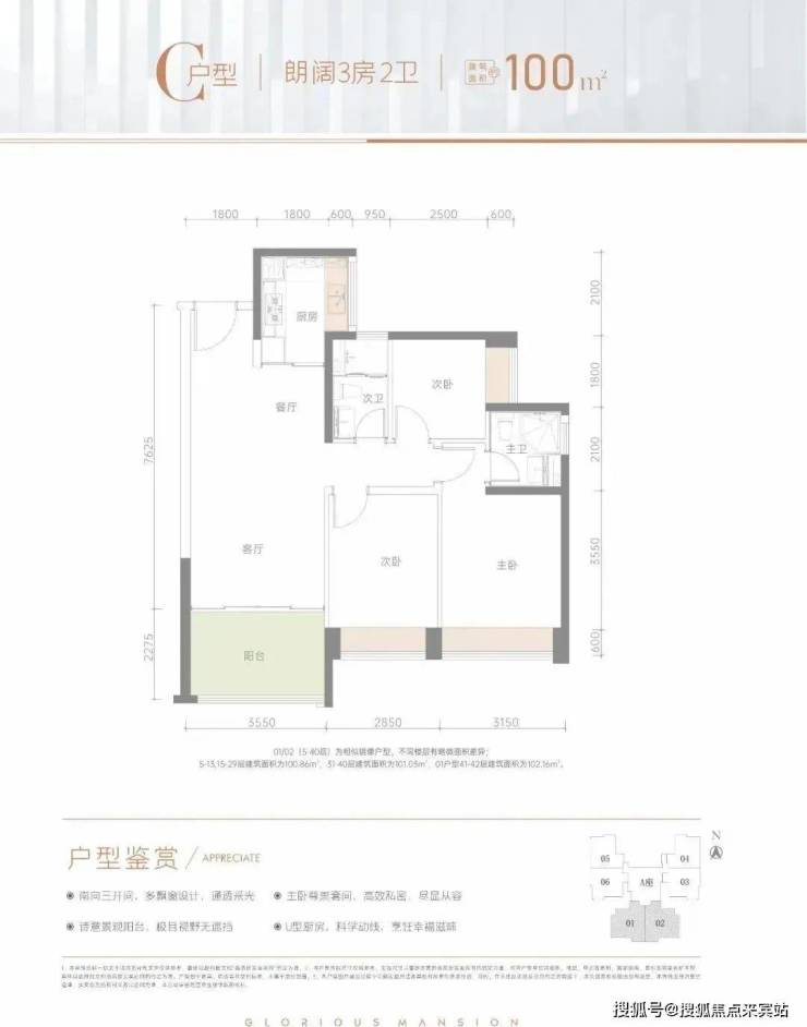 100㎡的3房2厅2卫,1栋A座01.02户型,设计的是竖厅格局,LDKB一体化,动静分区,三开间朝南,U型厨房,卫生间干湿分离,正南朝向。