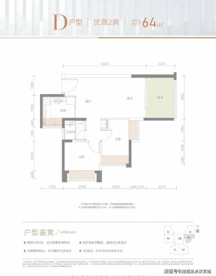 64㎡的2房2厅1卫,仅1栋A座03户型才有,设计的是竖厅格局,LDKB一体化,双卧室朝南向,次卧双飘窗设计,U型厨房,卫生间干湿分离,朝正西向。