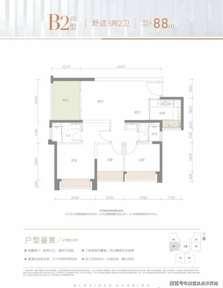 88㎡的3房2厅2卫,仅1栋A座06户型才有,设计的是竖厅格局,LDKB一体化,动静分区,三个卧室都朝南向,U型厨房,公卫三段式分离,正东朝向。