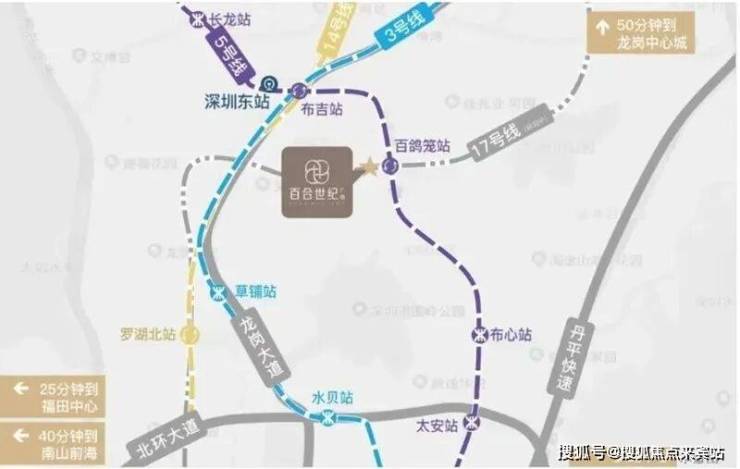 百合世纪广场项目有规划中的5/17号线百鸽笼站双地铁线上盖,1站可换乘3/14号线、4站可达福田、1站可达深圳东站、7站可达深圳北站,项目还临近主干道,离龙岗大道仅约1公里,离丹平快速仅约2.5公里,近距离连接北环大道、水官高速,快速通达全城各片区。