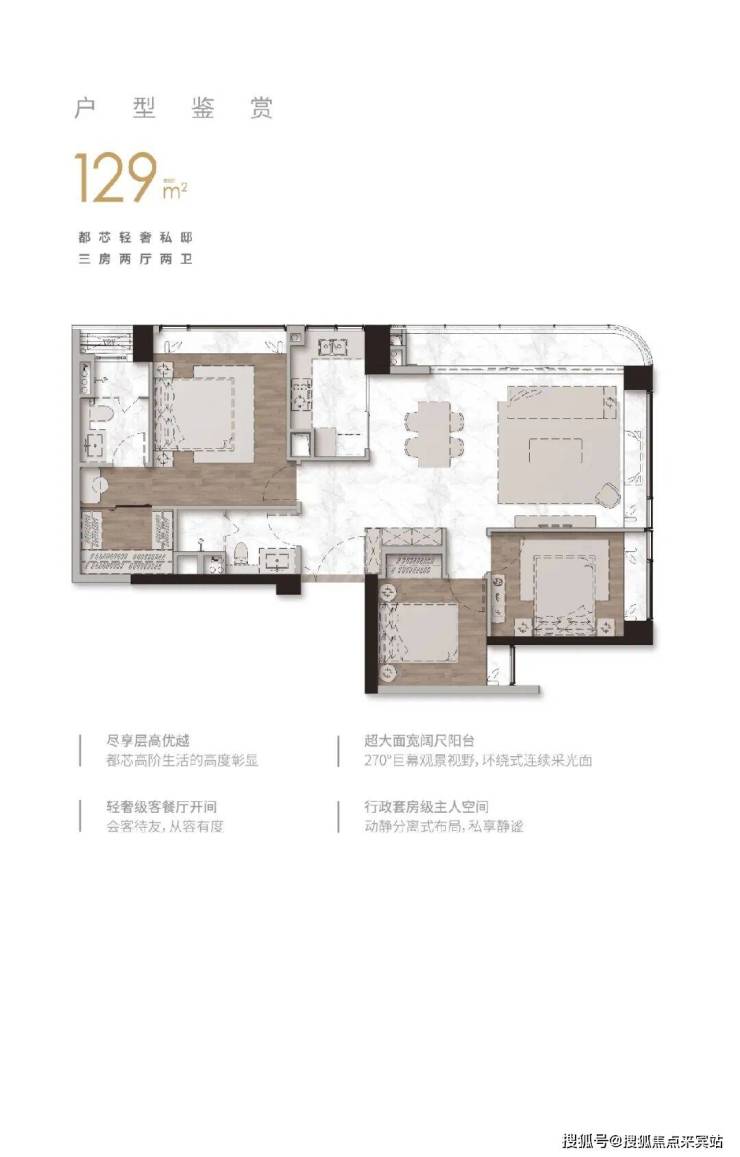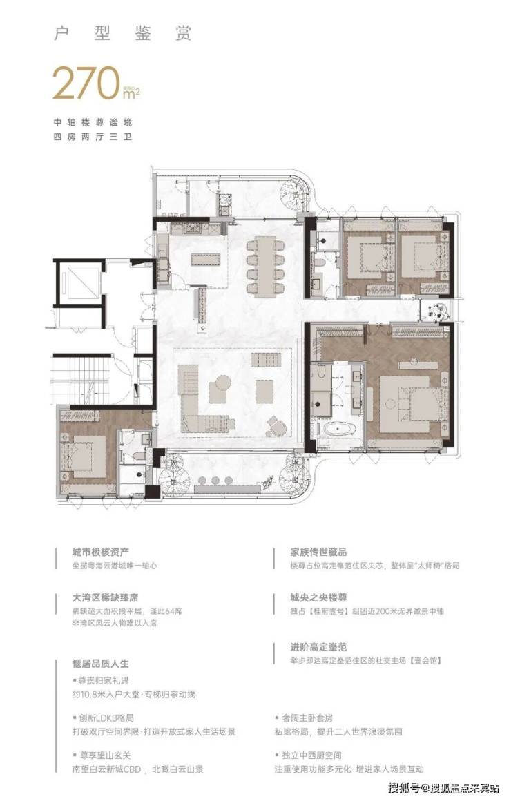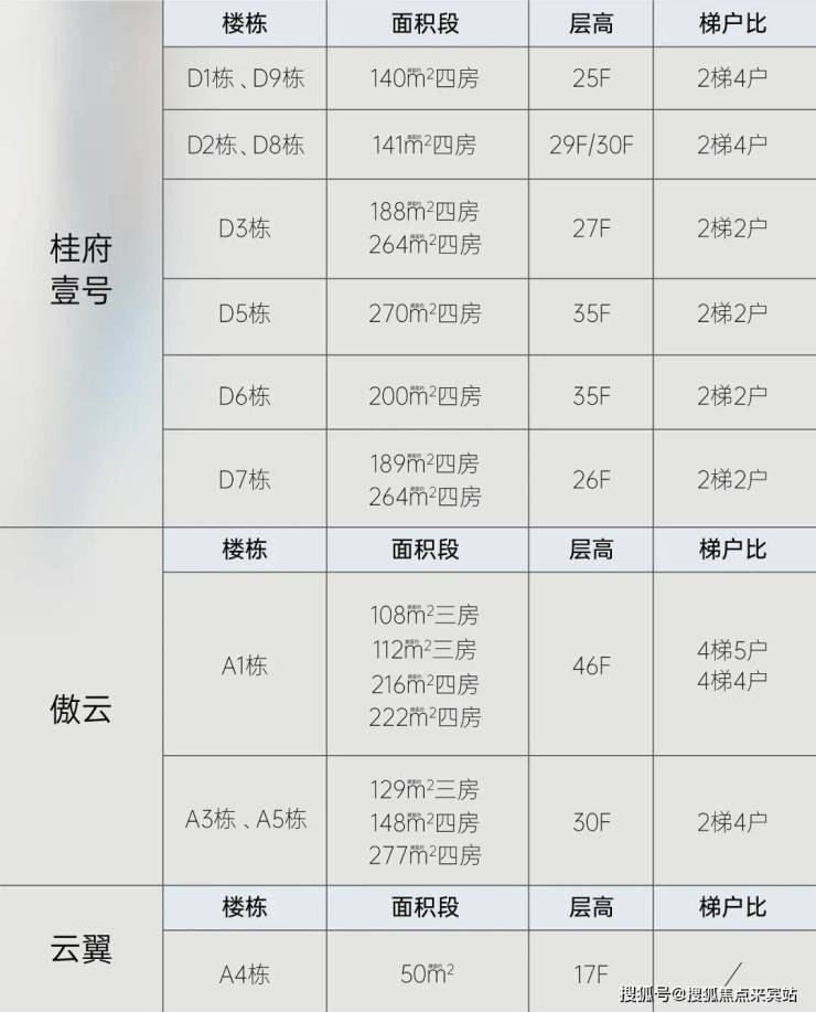 产品方面:目前在售D1~D9栋,总层数25-35层的140~270㎡四房为主,以及A1~A6栋面积108~277㎡的住宅式公寓,产品基本上属于塔尖顶级豪宅,低梯户比、低密度的改善型大平层(改善型)。