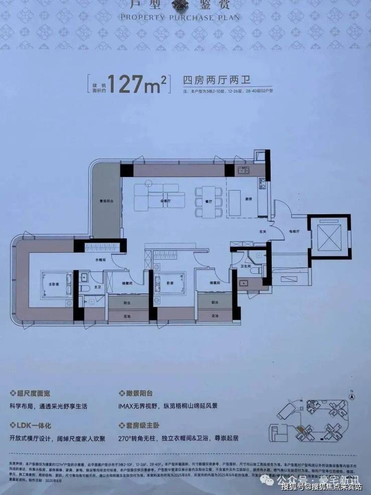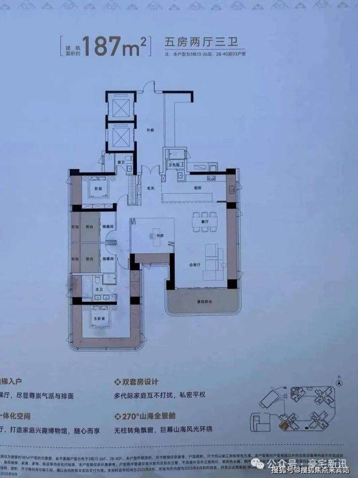 超高得房率:主力户型得房率约102%,约185㎡户型更是高达约111%,花同等价钱可多享约25-48㎡实用空间。270°寰幕全景舱:270°环幕视野及采光,搭配社交化户型布局,既保障山海景观的最大化呈现,又满足家庭互动、亲朋相聚的丰盛场景需求。