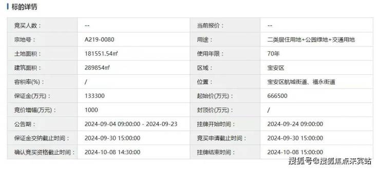 宗地挂牌起始价66.65亿元,竞买保证金13.33亿元,土地使用年限70年。