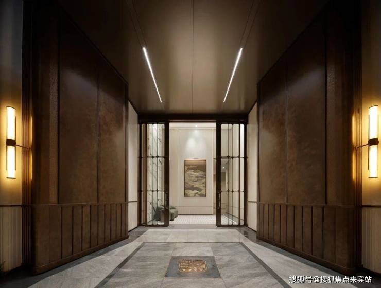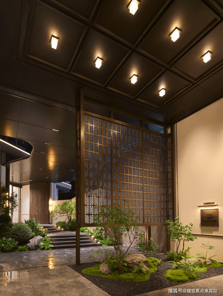 大堂外侧,两侧金属立面细看有西关打铜的工艺痕迹,大门选用岭南窗格搭配超白钢化清玻璃,沉稳中见通透。