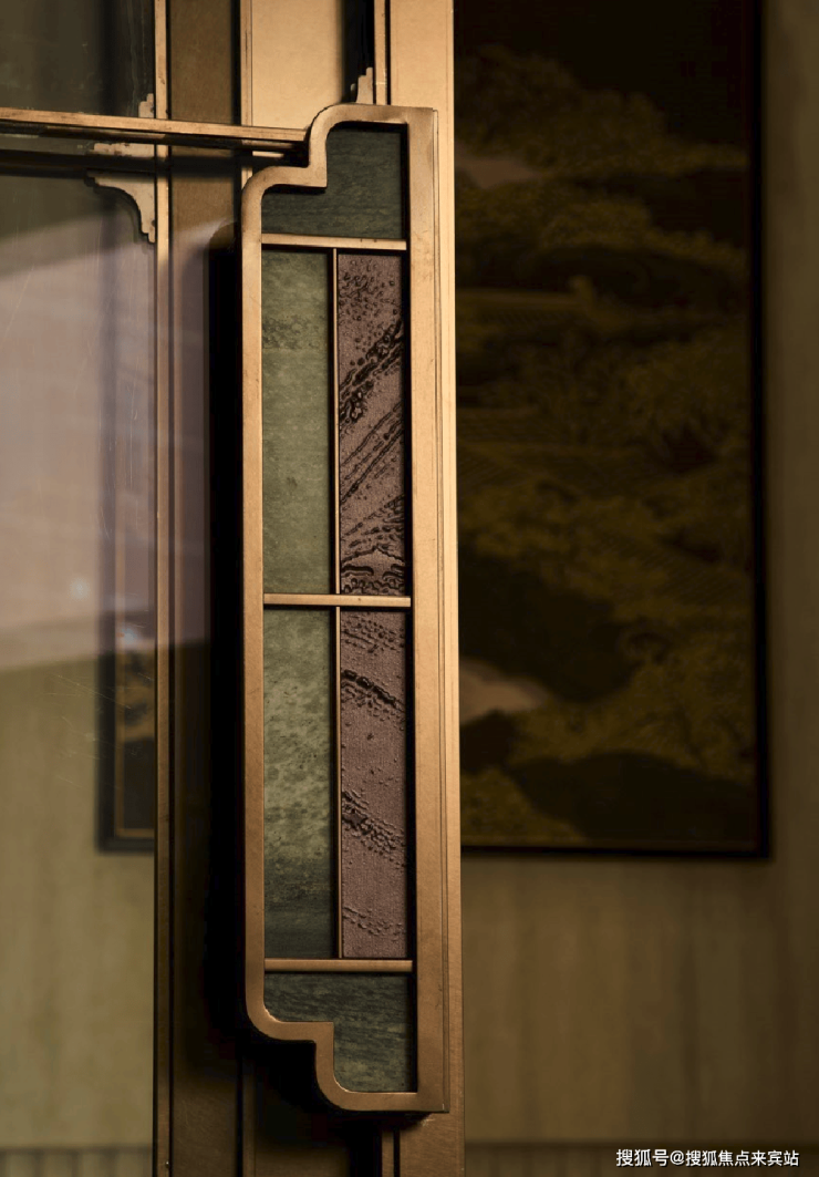 门把手是选用了“广府青”的天然奢石,手感温润,细节处见心思。