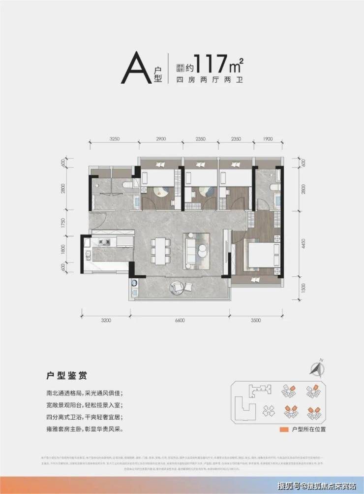 117㎡ 4房2厅2卫:稀缺南北通透、大横厅阔绰4房,约6.6米阔景阳台 ,四分离卫生间