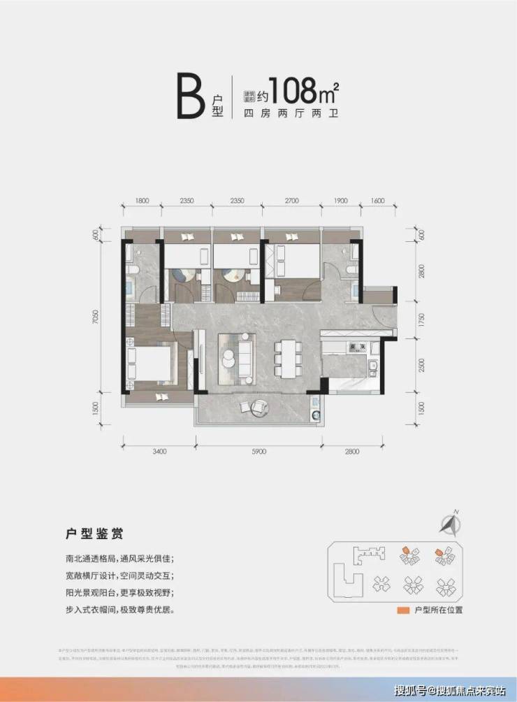 108㎡ 4房2厅2卫:稀缺南北通透4房,约5.9米阔绰阳台,三分离卫生间