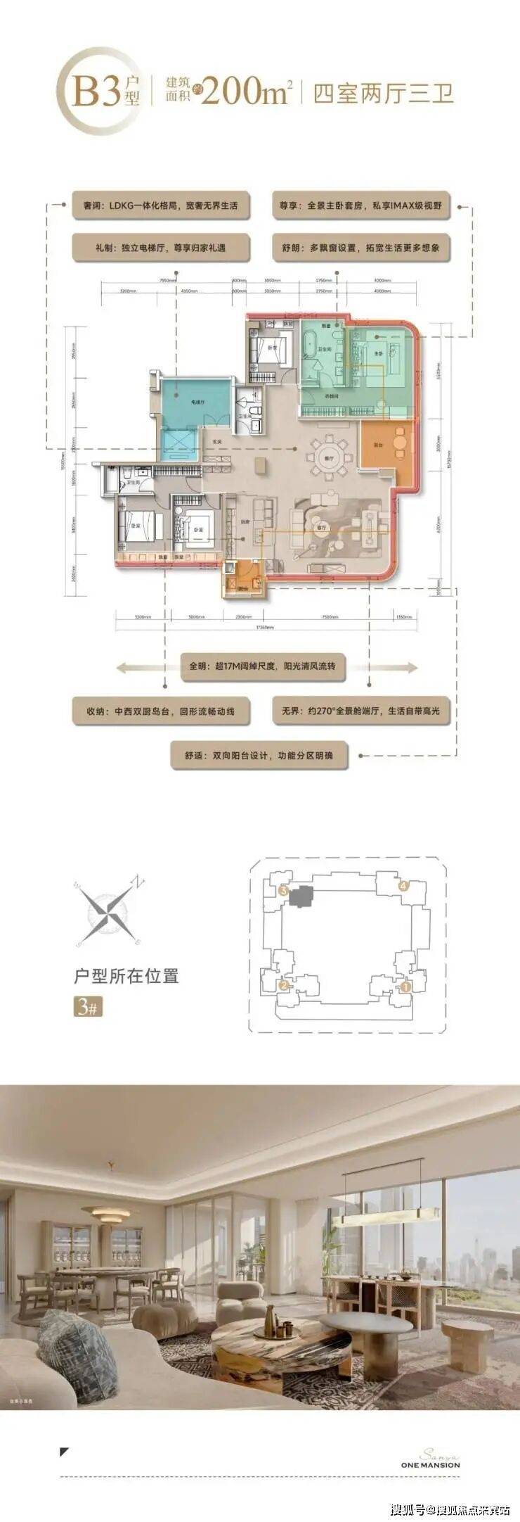 200㎡户型:IMAX 悬浮式全景舱,进阶版四室两厅三卫规划,在一梯一户、独立电梯厅、双玄关设计和LDKG一体化的基础上,实现270°乃至360°的无遮挡视野,享超18M面宽的广阔景观视野,南北通透与动静分区,配置两个主卧套房。