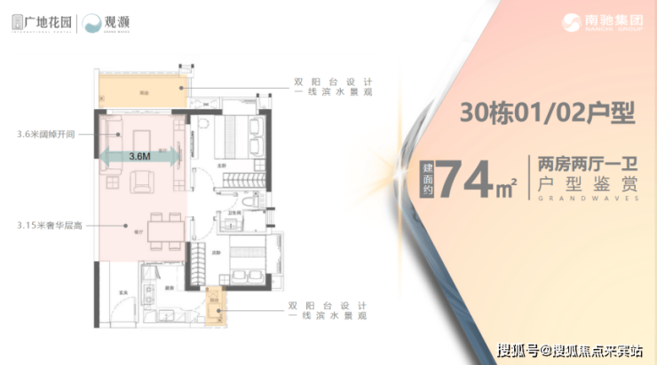 3.6 米宽的观景阳台正对着滨水长廊,实用率超过 80%,不用挤在小开间里。