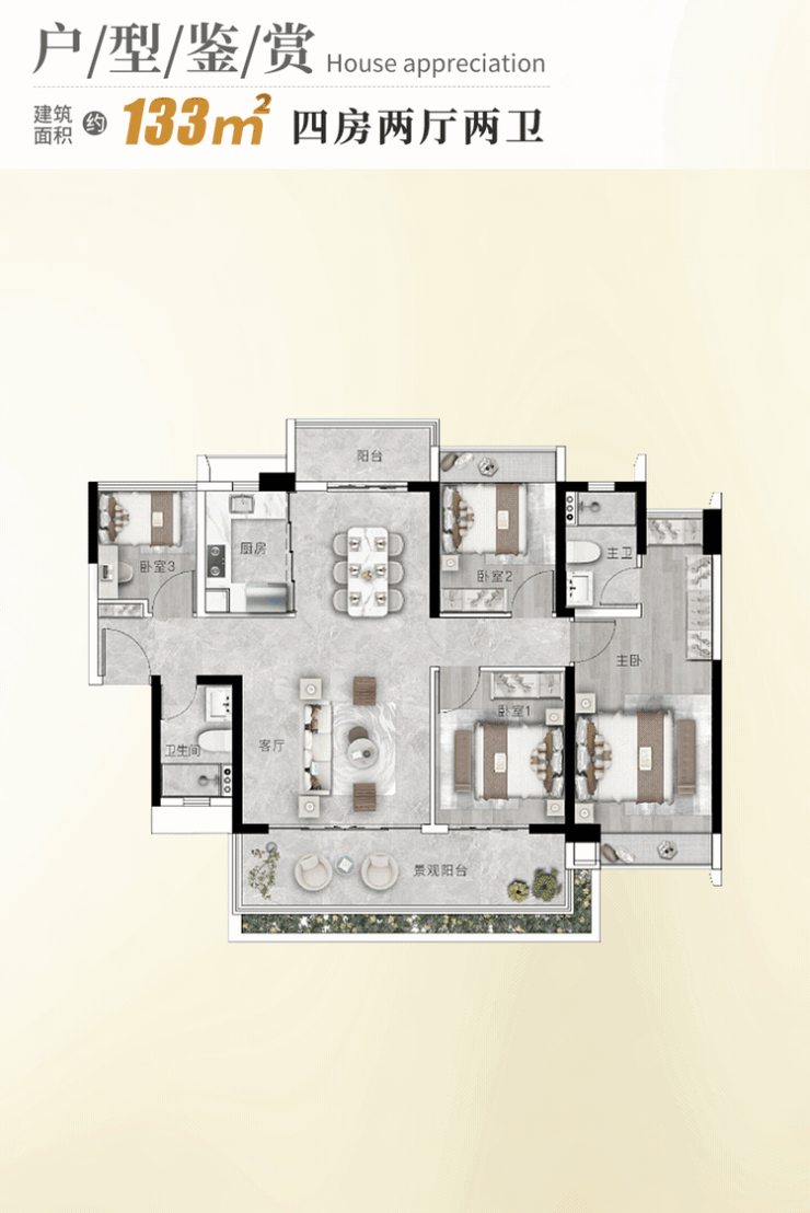 建面约138㎡四房,便将这种品质感演绎得淋漓尽致。