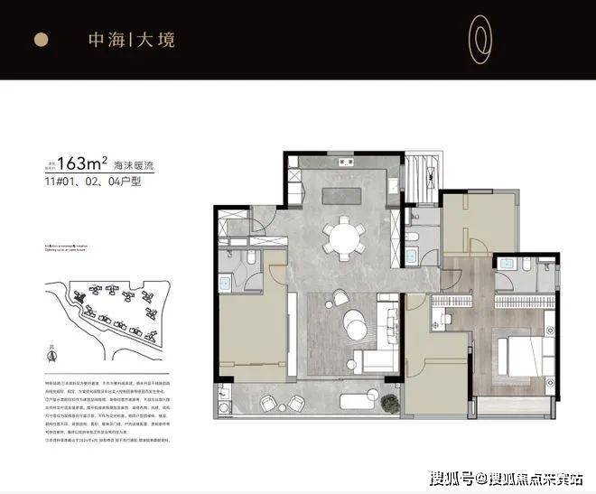 11栋04约163㎡户型,是社区内唯一东南看花园产品,约260米视觉通廊,2万㎡花园尽收眼底。