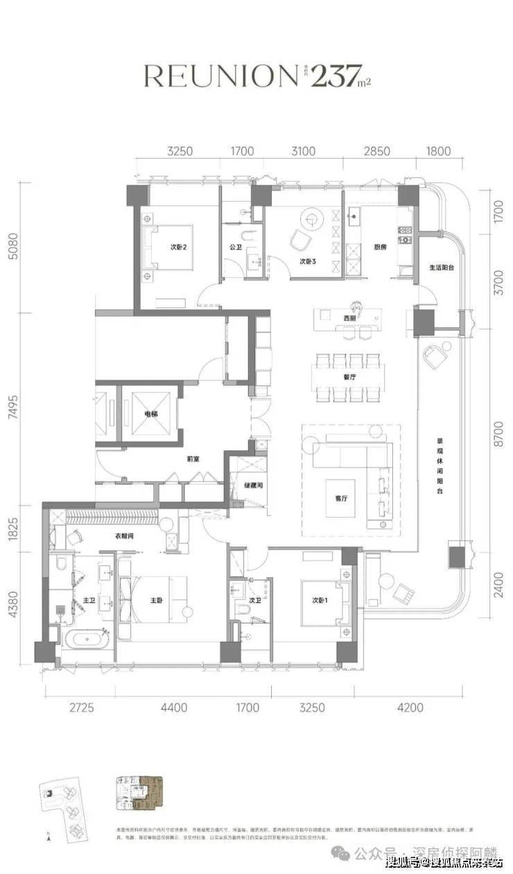建面约237㎡户型,含电梯厅综合赠送后使用率可达93-95%。