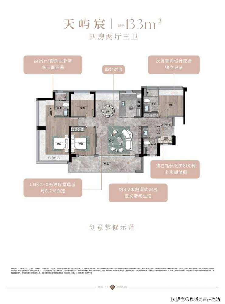 133㎡的4房2厅3卫,设计的是竖厅南北通透格局,进门入户玄关,客厅5.4米开间,餐客厅分离设计,分别做到了主卧24.5㎡/次卧10.2㎡/次卧8.96㎡/次卧7.84㎡(实测面积),客厅连接次卧出12.3m²的观景大阳台,L型中式+岛台灵动式厨房,公卫三段式干湿分离,得房率约79.5%(不含赠送),套内面积105.78㎡,阳台主朝东南或西南向。靓点:超大客餐厅南北对流+8.2米长超大观景南向阳台,超大主卧+270°无柱转角飘窗+进门独立玄关800库。