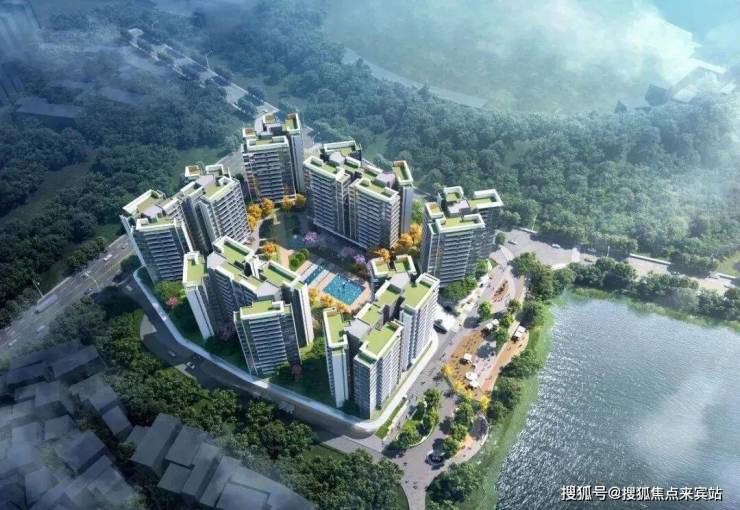 项目整体采用围合式布局,这样将景观做到了整体性,把公共配套最大化,结合了山水环绕的优势,小区中间是园林和泳池,外面的几栋楼有一些角度便宜,采光视野更加开阔。