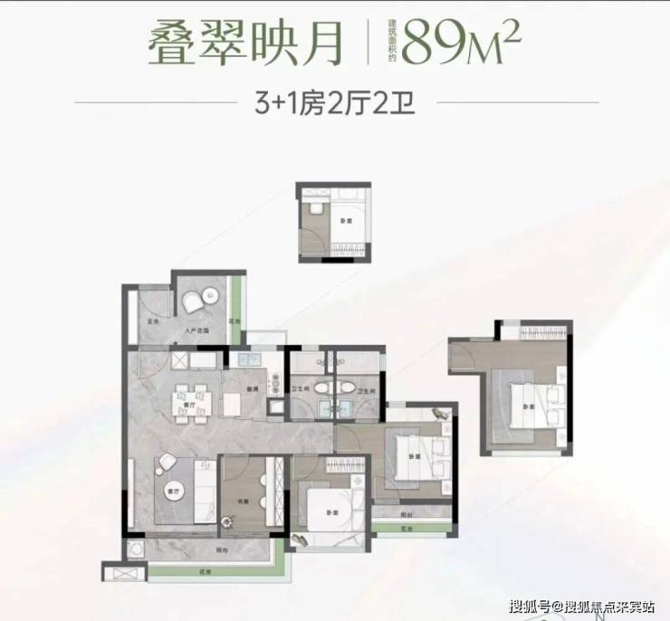 建面89平四房两卫,客厅6.2米进深,5.6米长阳台,该户型花池、阳台、飘窗等赠送面积高达9处,实用率非常高,也可以打掉客厅一面墙,做成5.4米长的大方厅,总价490-550万左右。