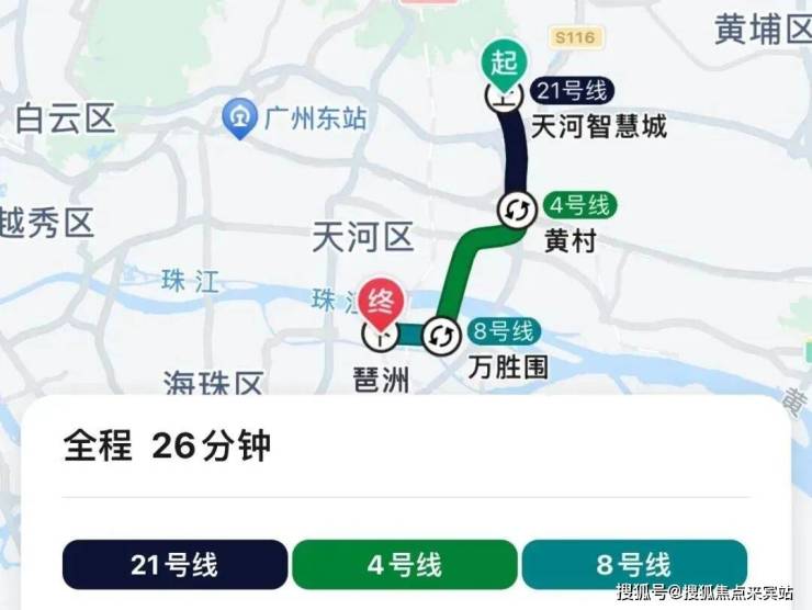 地铁去往琶洲:乘坐21号线到黄村换乘4号线,再到万胜围换乘8号线,需换乘2次,总6个站,地铁耗时26分钟,加上骑行至地铁口的时间,总耗时35分钟左右。