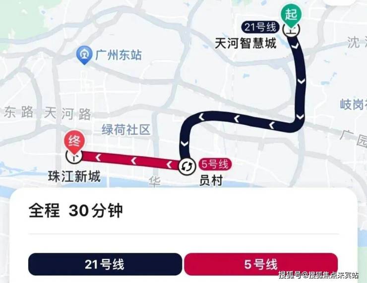 地铁去往珠江新城:小区骑行至地铁口,乘坐21号线到员村换乘5号线,再到珠江新城,全程8个站,地铁耗时30分钟,加上骑行时间总共39分钟左右。