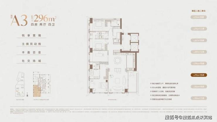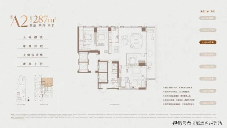 216㎡四房两厅三卫:入门顶豪,四房功能齐全,无保姆间,适合精英家庭;客厅 + 东向大阳台联动,阳台进深约 2.4 米;92%+ 实用率,框架核心筒无次梁,可微调布局。