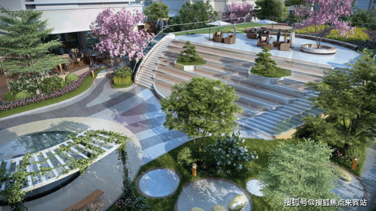 益田御龙天地携手日本景观大师凤咨询(Ohtori Consultants Environmental Design Institute),以现代手法解构都会自然,将自然延伸进生活的朝夕,精选本地特色植物,匠心打造约10000㎡雅致园林。在木头龙城市更新项目中传承和延续“自然生态”的城市空间理念,从绽放的花卉中提取设计语言,衍生“BLOOMING VILLAGE”的景观主题,让城市的记忆重新生长,再现爱国路迎春花市的特色场景。