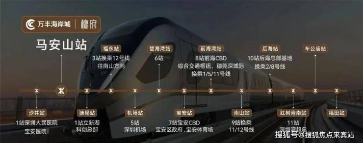 地铁配套:万丰海岸城檀府的交通配套极为便捷,形成了"地铁+公交+自驾"三位一体的立体交通网络。地铁方面,项目距离11号线马安山站直线距离约300-600米,步行3-5分钟可达,该站设有D出口直接连接项目,且站内设有母婴室、无障碍通道等人性化设施。11号线可与深圳地铁1号、2号、3号、5号、6号、7号、9号、12号等8条线路直接换乘,半小时可达宝安机场,40分钟可到南山科技园,50分钟可达福田中心。