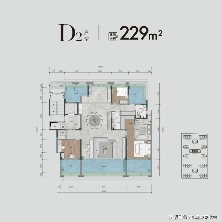 约199㎡的D1户型则更为阔绰,十字动线贯穿空间中部,中西厨、餐厅、客厅、阳台位于南北动线之上,相互贯通,功能交融的同时又保证相互独立,整体布局尺度感可满足各类社交需求,8人位标准圆形餐桌体现了中式家族礼仪和秩序。