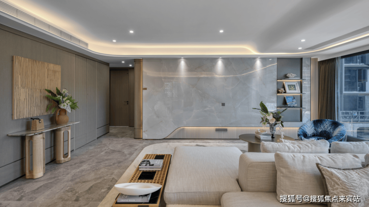 其中约143㎡B1户型做到4房3卫,三卧室朝南,采用约7米面宽的客餐一体横厅,动线清晰流畅。客厅背景墙处舍弃常规大理石材料,采用米白色系岩板来升华空间整体格调,既不会过于刺眼也不会显得沉闷,给人一种平静舒适的感觉。客厅采用超大落地窗,确保了开阔的视野与充足的自然光线。独立的岛台和mini bar不仅丰富了客厅的功能性,其独特的导光板材质也为房间增加低调的奢华气质。