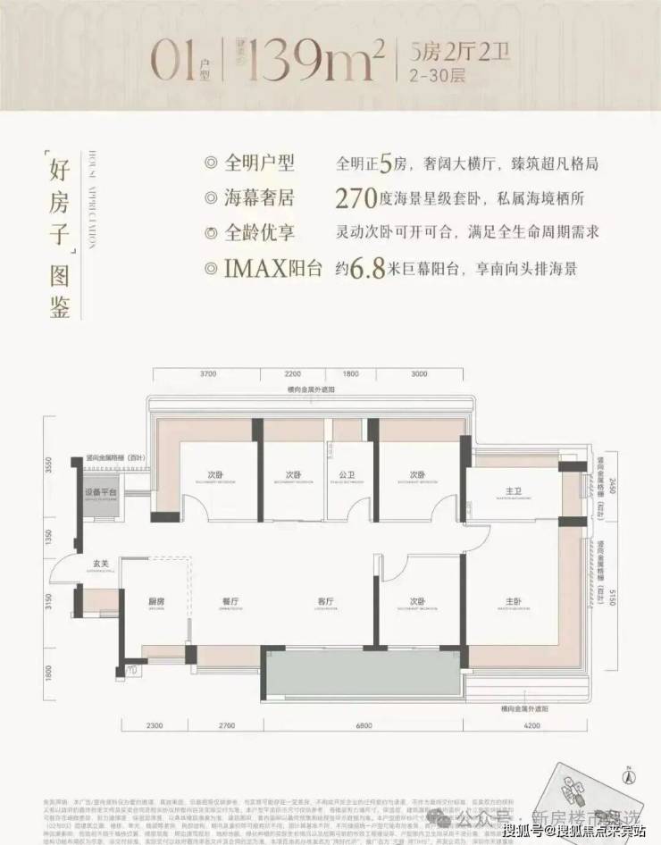 139㎡的5房2厅2卫,设计的是横厅南北通透格局,进门可做800库玄关还带1个设备平台,客餐厅6.5米开间,LDKB一体化,六开间朝南,分别做到了主卧21.63㎡/次卧13.13㎡/次卧10.65㎡/次卧9.45㎡/次卧7.81㎡(包含墙体飘窗),U型厨房,卫生间干湿分离,得房率约81.4%(不含赠送),客厅连接次卧出6.8米长的观景大阳台约12.24㎡,西南朝向。