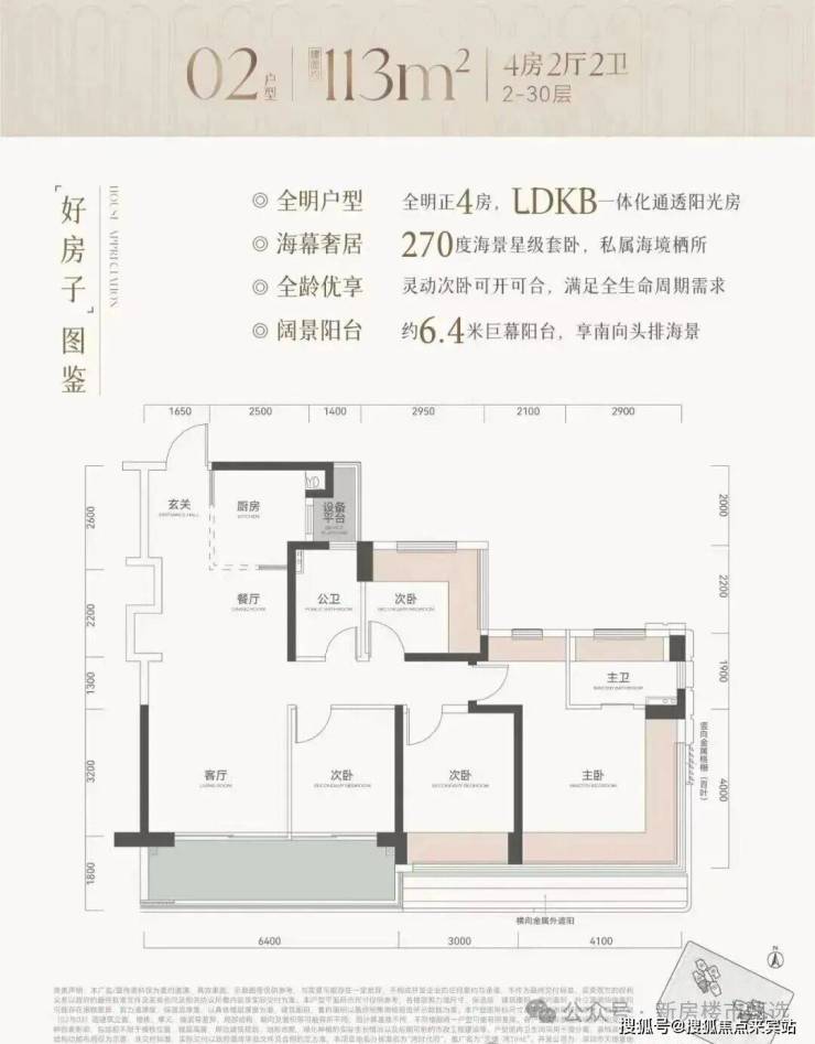 113㎡的4房2厅2卫,设计的是经典竖厅格局,客厅3.7米开间,LDKB一体化,S墙设计预留冰箱卡槽位,动静分区,四开间朝南,分别做到了主卧20.39㎡/次卧12㎡/次卧8.85㎡/次卧8.64㎡(包含墙体飘窗),U型厨房还带1个设备平台约2.7㎡,卫生间干湿分离,得房率约81.4%(不含赠送),客厅连接次卧出6.4米长的大阳台约11.52㎡,西南朝向。 套内面积92.22㎡+飘窗15.36㎡+阳台5.76㎡+设备平台2.7㎡=实得面积116.04㎡,加上赠送后得房率约102.37%。