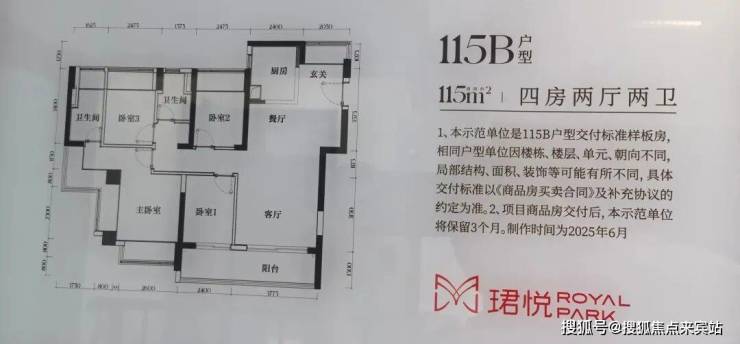 【115㎡四房2卫 B户型】2栋1单元01/06户(西南向),景观指向裕安学校及周边城中村。