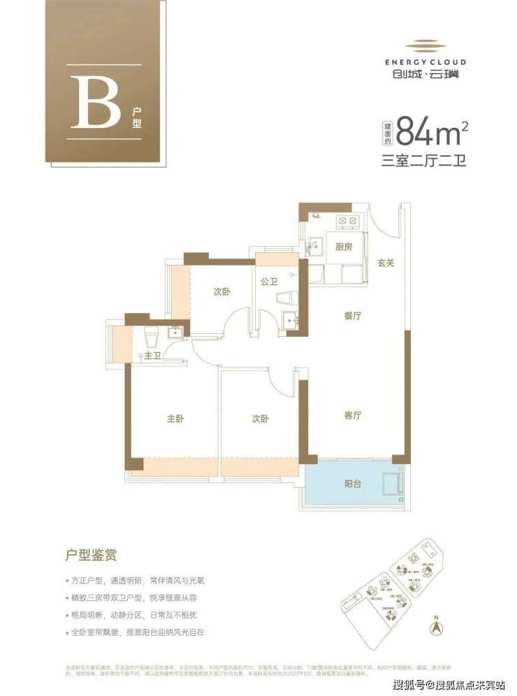 84㎡三房户型,格局跟89㎡的差不多,但跟市场上产品比,同等面积做到了少有的2卫。