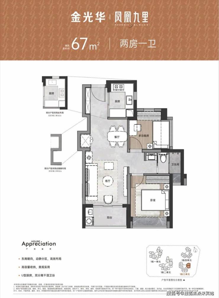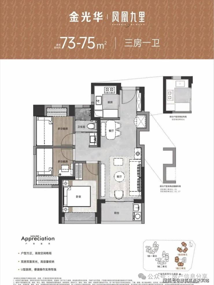 金光华凤凰九里开盘时间为2023年11月,推出1栋1/3单元,共430套房源,面积68-106㎡,2-4房,金光华凤凰九里得房率达到80%,加上赠送面积约90%,还是很不错的,目前在售产品折后总价区间,67m²2房1卫:215-238万,74m²3房1卫:230-259万,85m²3房2卫:270-318万,106m²4房2卫:350-425万,67平米两房0首付5万定金即可上车,月供30年8900左右每个月!74平米0首付定金5万三房月供9800上车
